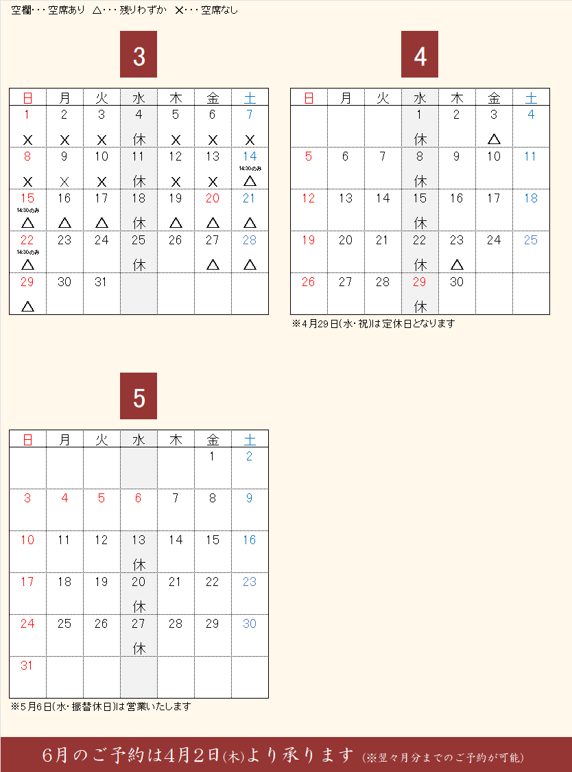 「茶房 半兵衛」のご予約状況(※3/13更新)