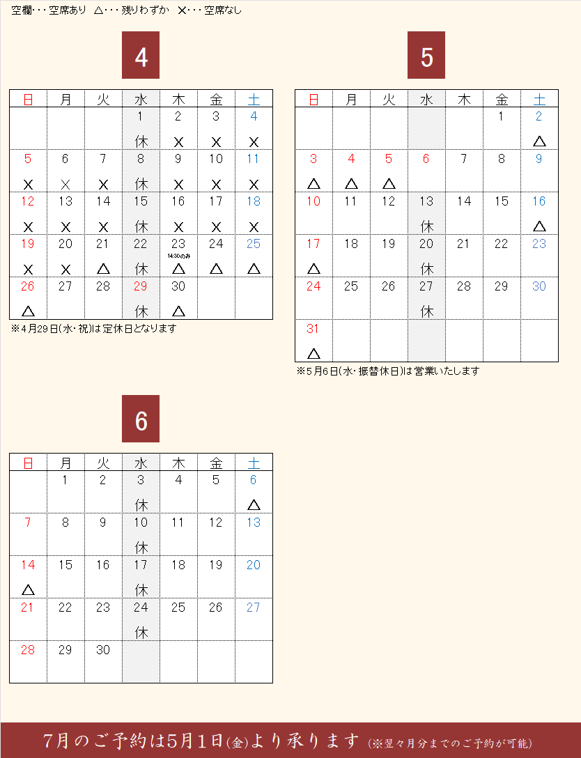 「茶房 半兵衛」のご予約状況(※4/21更新)