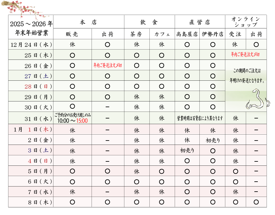 各店の年末年始の営業日のご案内をさせていただきます。