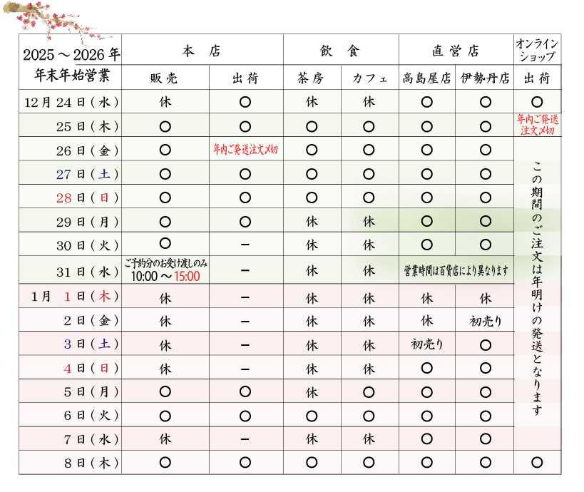 ※オンラインショップでは年始も引き続きご注文を承っておりますが、問い合わせ等のご対応は1月5日からとなります。