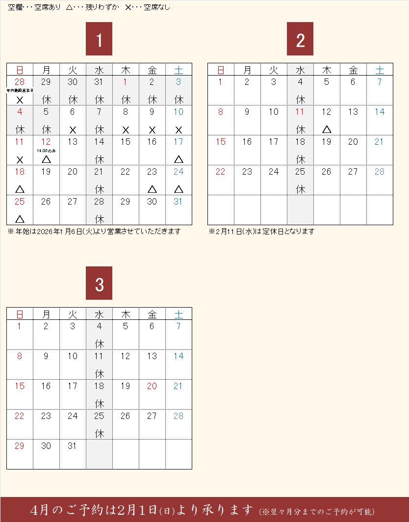 「茶房 半兵衛」のご予約状況(※1/12更新)