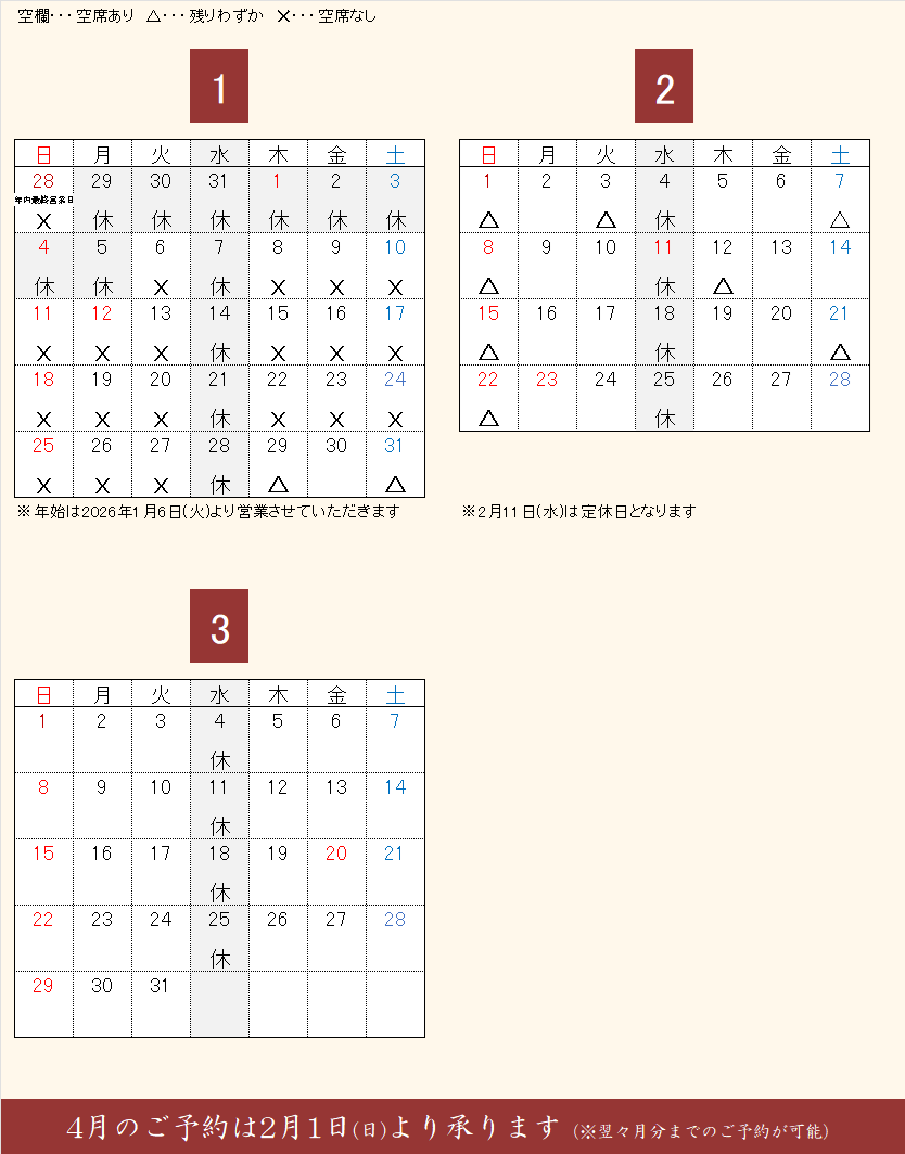 「茶房 半兵衛」のご予約状況(※1/29更新)