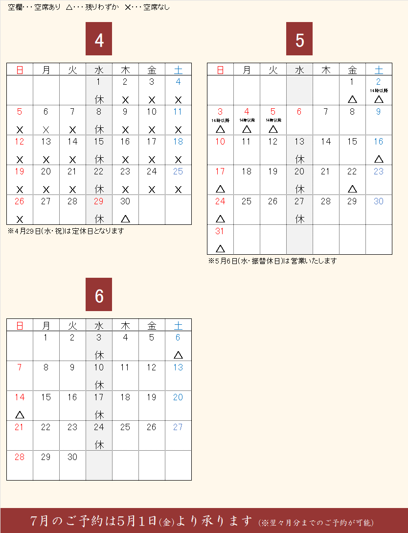 「茶房 半兵衛」のご予約状況(※4/27更新)